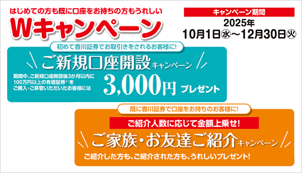 期間中、ご新規口座開設後3か月以内に100万円以上の有価証券をご購入・ご移管いただいたお客様には3,000円プレゼント。 ご紹介した方も、ご紹介された方も、うれしいプレゼント!